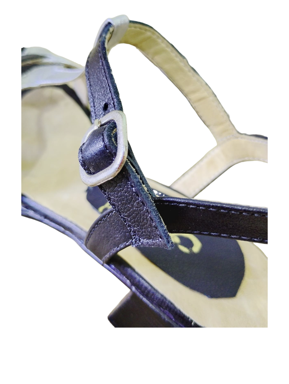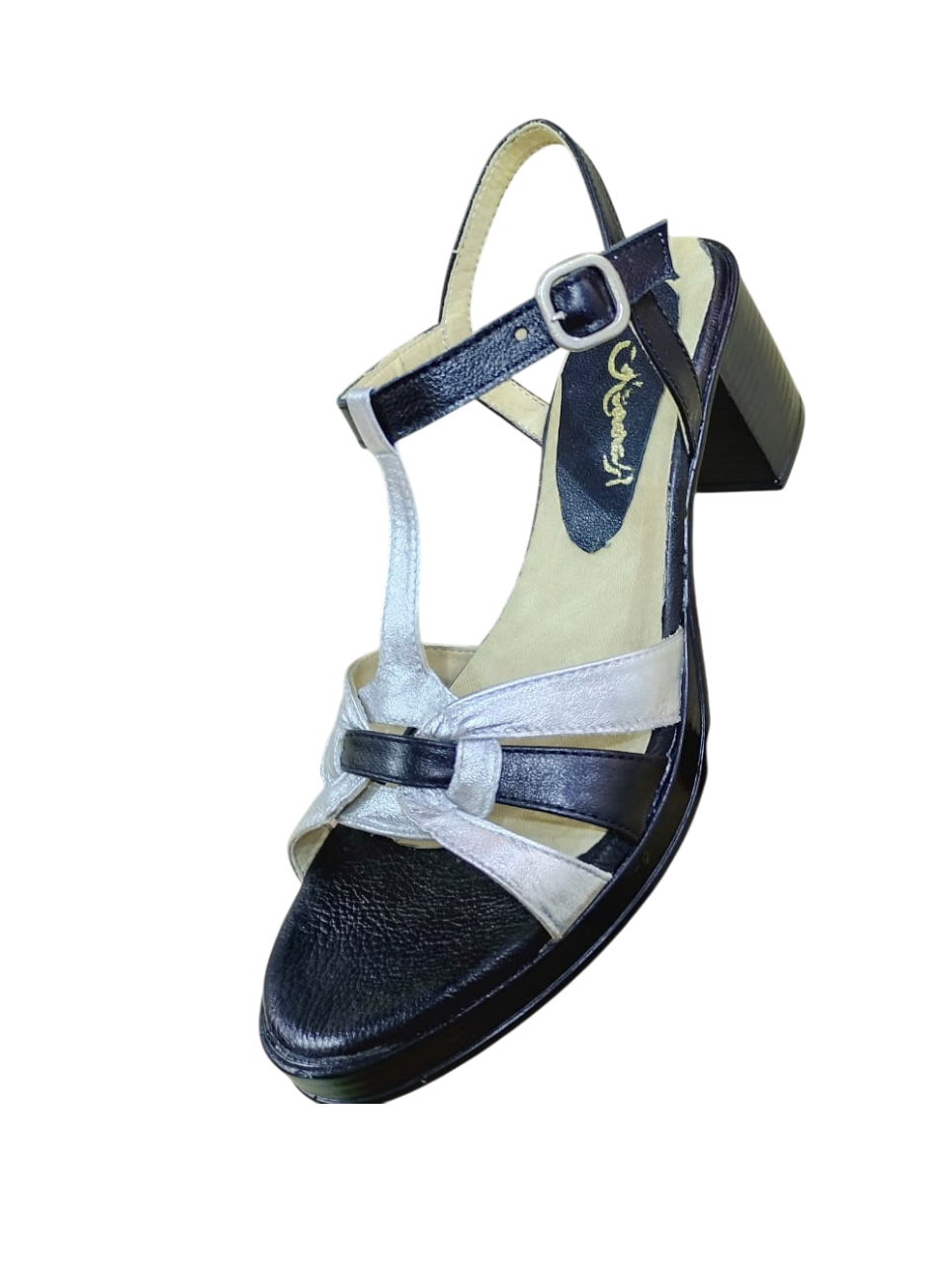 Confeccionada íntegramente en cuero genuino, su combinación de negro con detalles plateados aporta luz y sofisticación, logrando que el pie se vea prolijo, femenino y estilizado.